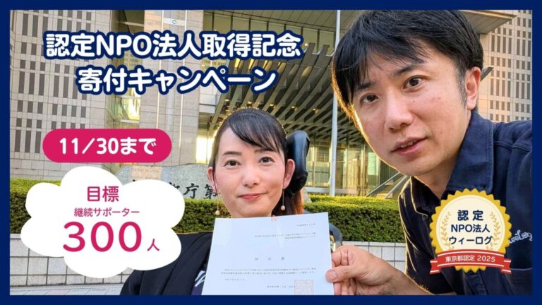 認定NPO法人取得記念 寄付キャンペーン あきらめない社会をつくる、新たなステージを目指して。 認定NPO法人として、新しい一歩を踏み出します! このたびWheeLog!は、認定NPO法人として正式に認定されました。 こ … 続きを読む 【11月30日まで】 認定NPO法人取得記念 寄付キャンペーン