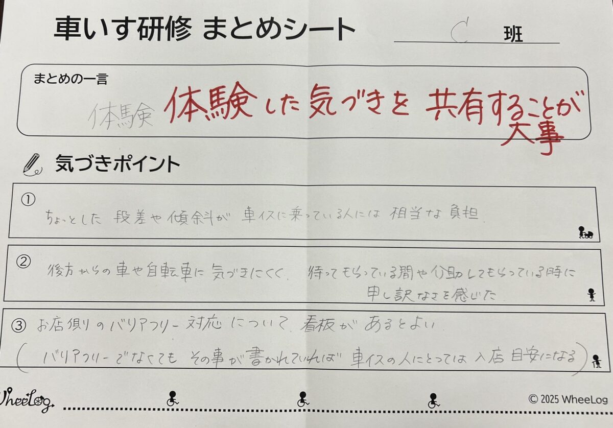 研修後には、「自治体の新人研修にも取り入れたい」、といった、次世代や組織全体への広がりを期待する声を多数いただきました 。皆様の「体験」が車いすでもあきらめない世界をつくる一歩になっていきます。