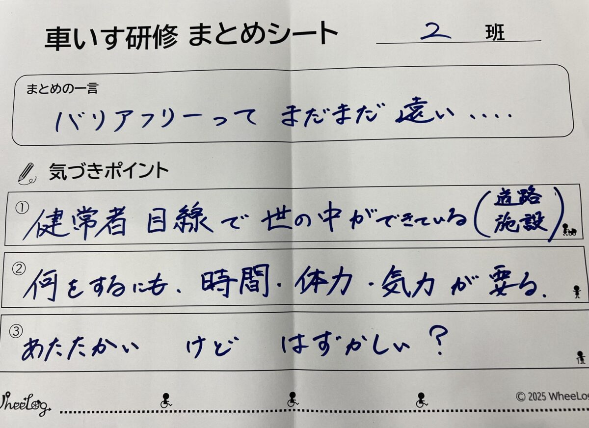 スロープの傾斜や手動ドアの扱いにくさから、街が健常者目線で作られていることを痛感しました。一方で、市民からの温かい声かけに触れ、人のサポート(ソフト面)がハードの壁を越える力になることを学びました。
