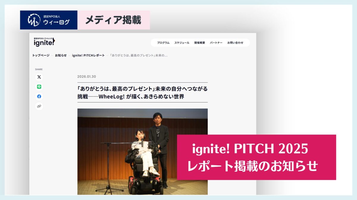 その主要プログラム「ignite! PITCH 2025」に登壇し、最優秀賞を受賞した認定NPO法人ウィーログ代表・織田友理子のピッチが、このたび ignite!公式サイトのPITCHレポートとして公開されました。