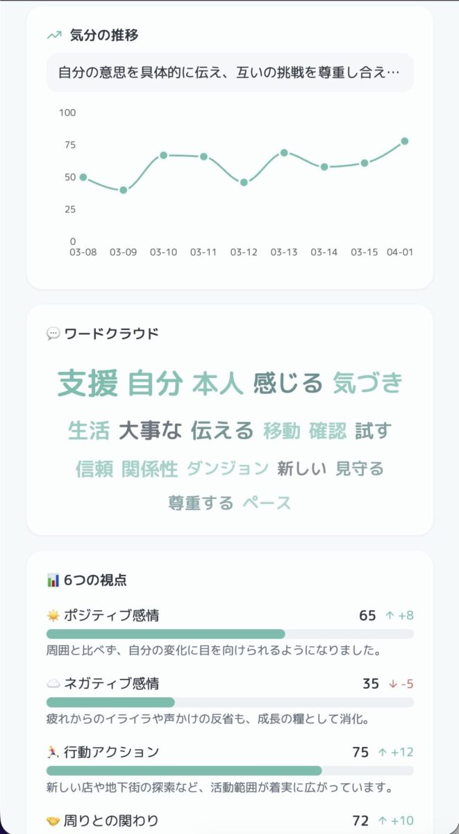 「自分の考え方を知るっていうのは結構重要と言われている中で、日々思ったことを綴ることでAIが分析して可視化してくれるのはすごく良いと思いました。SNSに投稿する時も文章をすごく考えてしまうので、パパッと文章化して手助けしてくれるのはありがたいです」