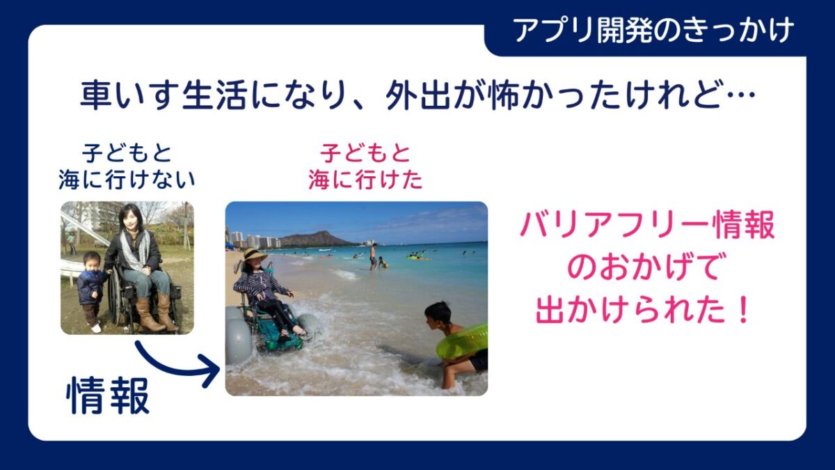代表の織田友理子は車いすになってから引きこもっていた時期がありました。そんなある日、インターネットでバリアフリービーチの情報を見つけました。それまであきらめていた息子を海に連れて行くことが、一気に現実味を帯びました。